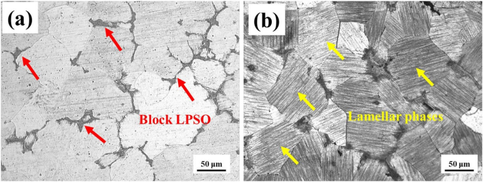 图1.均质化样品的OM图像:(a)水淬样品,(b)真空冷却样品。