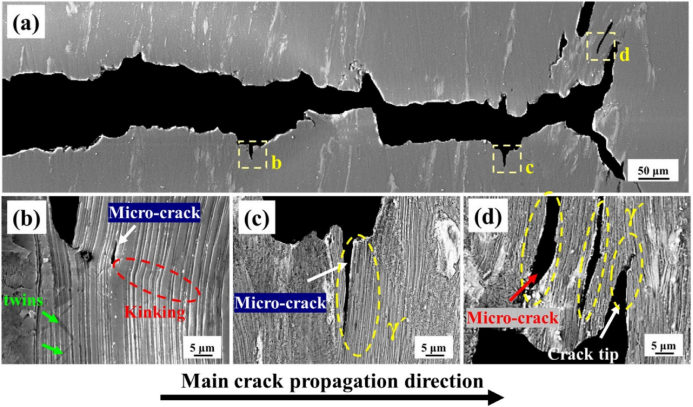 图8.不连续断裂韧性测试中QE样品中平面截面的显微组织,(a)整个裂纹扩展路径,(b)主裂纹附近变形晶粒中的孪晶,(c)块体LPSO相诱导的微裂纹,(d)主裂纹尖端前方的微裂纹。