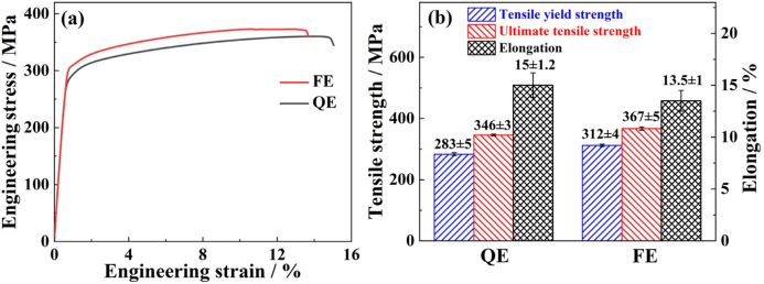 图5. QE和FE样品的拉伸性能:(a)工程应力-应变曲线,(b)拉伸强度和伸长率的列分布。