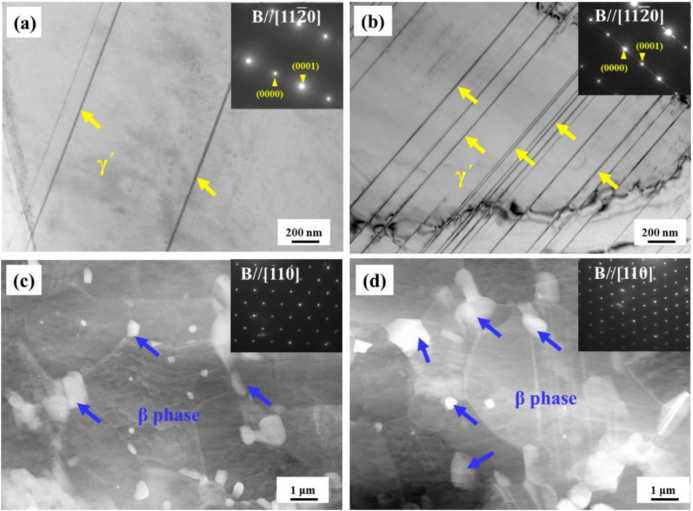 图4.(a,c)QE样品和(b,d)FE样品的TEM明场图像和相应的SAED图案;(a,b)变形晶粒区域,(c,d)DRX区域。