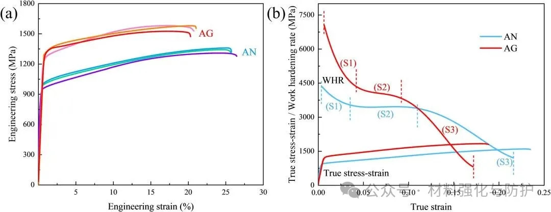 独特的微观结构进一步加剧了合金内部不同结构之间的机械性能不匹配,从而进一步激活了HDI强化,LUR循环拉伸实验显示,在变形初期,AG态样品的HDI应力可达653MPa,显著高于退火态(512MPa),当应变在0.05-0.09之间时,AG样品的HDI加工硬化率再次增加,团队将这一现象归因于析出物的贡献。