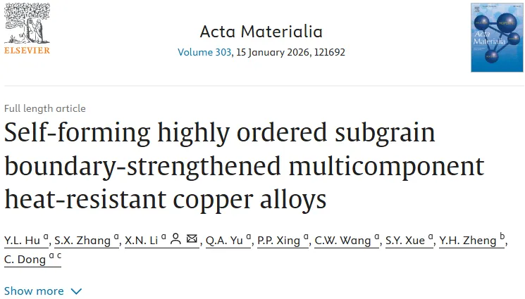 针对这一问题,2025年11月1日,大连理工大学兰州理工大学大连交通大学三校联合在材料领域国际期刊《Acta Materialia》在线发表了一篇名为“Self-forming highly ordered subgrain boundary-strengthened multicomponent heat-resistant copper alloys”的研究性论文,该研究团队提出了一种新的设计范式,克服了析出强化耐热铜合金的强度-塑性-稳定性之间的权衡。通讯作者为大连理工大学李晓娜教授