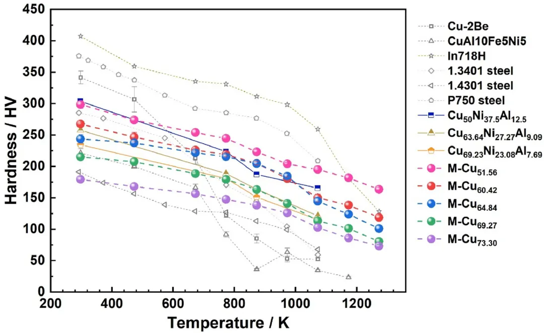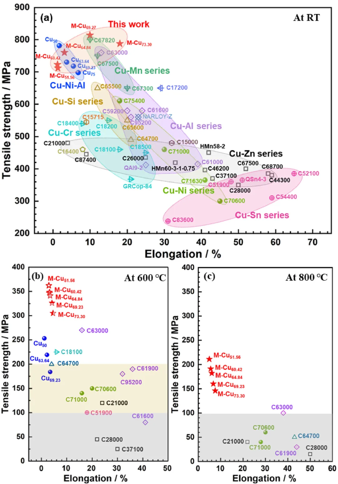 与目前已报道或已商用的Cu-Cr-Zr、Cu-Al2O3以及传统Cu-Ni-Al体系相比,本研究合金在耐热性能与塑性储备两方面均实现明显跃升,展示出面向高温服役领域的实际应用潜力。