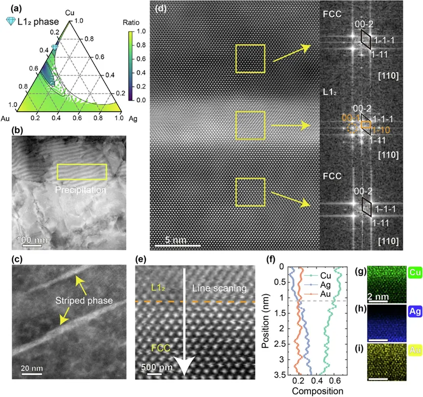 该研究采用简单的真空熔炼与退火工艺制备出等原子CuAuAg中熵合金,无需机械多次叠锻,即可在材料内部形成自发的多尺度层级结构。该结构包括:微米尺度的Cu-rich与Ag-rich条带式相分离,纳米尺度的L12有序析出相,以及原子尺度的化学短程有序(CSRO)。这种由宏观至原子的层级组织,有效实现了强化机制的层层传递,从而获得优异的力学综合性能。