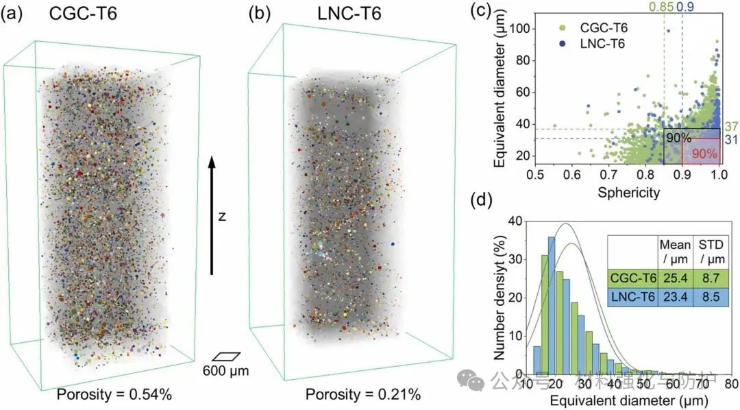 CGC-T6与LNC-T6气孔三维形貌与体积分数统计