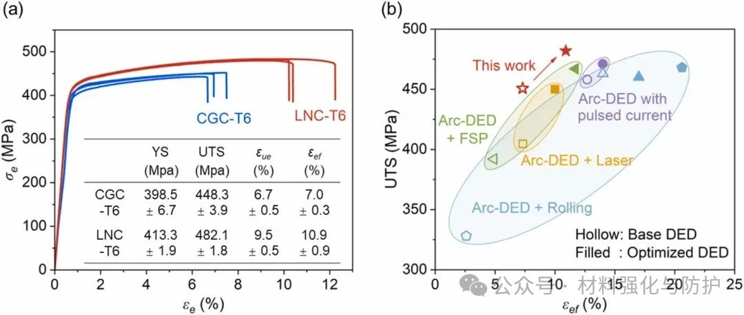 LNC-T6样品抗拉强度由448MPa提升至482.1MPa,延伸率从7.0%提高至10.9%,基于指数应变硬化模型(ESH)分析发现,延展性提升中约69%来源于异质组织带来的增强应变硬化能力,而31%来源于孔隙减少引发的变形稳定性提高,这表明本策略真正实现了组织调控与缺陷抑制的协同优势,而非性能相互牺牲的简单折中。