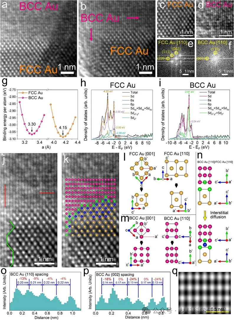 近年,在压力介于225至298 GPa之间的冲击波压缩实验中,首次通过原位X射线衍射(XRD)检测到BCC金[1]。此外,当对金纳米晶体施加拉伸力时,在晶体颈缩过程中或断裂后也观察到了局部的BCC结构[2,3]。除了BCC金之外,在银丝的弯曲过程中,为了适应压缩区域的应变,也在FCC-BCC-HCP-FCC相变路径中观察到了银的BCC瞬态结构[5]。值得注意的是,电场也对bcc结构转变产生影响,文献4介绍了在电子辐照过程中,FCC结构的金薄膜中形成了纳米尺度的BCC金结构,但在进一步辐照后转变为非晶态。