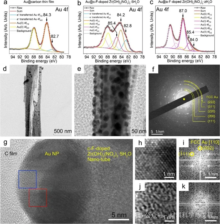 另外,从非晶金中形成的BCC金与FCC金形成了热力学更稳定的{1 1 0}BCC Au ‖{1 0 0}FCC Au共格界面。X射线光电子能谱(XPS)分析发现,微纳米管表面的金纳米颗粒内部发现了电子自转移,形成了正一价和负一价金。DFT计算表明微纳米管表面负离子与金纳米颗粒接触,该界面电场诱发了上述电子自转移。该课题组提出,这种电子转移提高了金原子的电子云密度,电子云与金离子核的库伦吸引作用更强,增强了金属键合强度,具有相对更小晶面间距的BCC金表现出更高的热力学稳定性。
