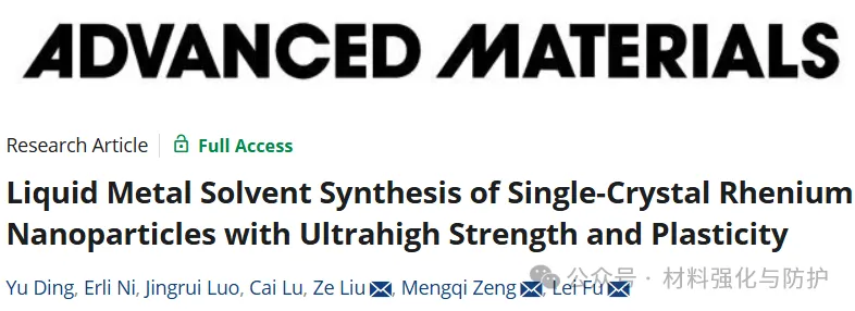 这些缺陷会显著削弱其机械性能,使其实际强度远达不到其理论极限,因此,获得真正高质量、无缺陷、可控形貌的难熔金属单晶纳米结构,是困扰很多金属材料学家的问题。2025年10月29日,武汉大学以刘泽教授、曾梦琪教授和付磊教授为通讯作者,在材料领域的权威期刊《Advanced Materials》在线发表了题为“Liquid Metal Solvent Synthesis of Single‐Crystal Rhenium Nanoparticles with Ultrahigh Strength and Plasticity”的最新研究工作。在该论文中团队提出了一种基于液态金属Ga的溶剂重构策略,实现了高对称形貌且接近无缺陷的单晶铼纳米颗粒制备,并首次测得高达67.8 GPa的金属强度纪录,同时仍保持高达约80%的塑性变形能力而不破裂,这意味着,该材料不仅“硬得史无前例”,而且“还能拉、能压、能形变而不断”,可直接面向航空航天极端结构、推进喷口、耐烧蚀部件等苛刻服役环境。