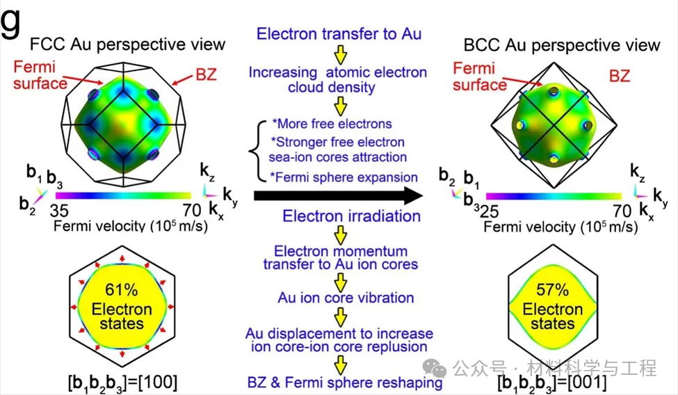 在常温常压条件下,元素周期表中的大多数金属元素会形成相对致密、热力学更稳定的体心立方(BCC)、面心立方(FCC)和密排六方(HCP)三种晶体结构之一 [1]。对于纯金属而言,通过调整温度场或应力应变场,可能使部分族元素形成上述三种不同结构,甚至其他衍生结构。举例来说,通过常压温度调节可以使钛族元素(钛Ti、锆 Zr 和铪 Hf)形成上述三种结构,当施压超过2 GPa时,Ti和Hf还会形成ω相,一种BCC结构的畸变衍生相。相比之下,铜族元素(铜 Cu、银 Ag 和金 Au)在常压下仅呈现FCC结构,即使温度升高至其各自的熔点也不会发生结构转变,在室温下,缓慢加压数百 GPa仍具有高度稳定性。 近年,在压力介于225至298 GPa之间的冲击波压缩实验中,首次通过原位X射线衍射(XRD)检测到BCC金[1]。此外,当对金纳米晶体施加拉伸力时,在晶体颈缩过程中或断裂后也观察到了局部的BCC结构[2,3]。除了BCC金之外,在银丝的弯曲过程中,为了适应压缩区域的应变,也在FCC-BCC-HCP-FCC相变路径中观察到了银的BCC瞬态结构[5]。值得注意的是,电场也对bcc结构转变产生影响,文献4介绍了在电子辐照过程中,FCC结构的金薄膜中形成了纳米尺度的BCC金结构,但在进一步辐照后转变为非晶态。 中国科学院金属研究所李阁平研究员课题组首次成功合成了氟离子掺杂、沿[001]方向生长的Zr(OH)2(NO3)2·5H2O锆氢氧化物硝酸盐微纳米管,通过物理溅射沉积法在微纳米管表面制备出分散排列的金纳米颗粒,光照下产生较强的表面等离子体,通过透射电子显微镜(TEM)观察金纳米颗粒发现,在200keV电子辐照下,非晶金和部分FCC金转变为BCC金,且在持续辐照下稳定存在。BCC金结构由高分辨TEM图像分析,DFT计算和高分辨TEM图像模拟综合确定。 另外,从非晶金中形成的BCC金与FCC金形成了热力学更稳定的{110}BCC Au‖{100}FCC Au共格界面。X射线光电子能谱(XPS)分析发现,微纳米管表面的金纳米颗粒内部发现了电子自转移,形成了正一价和负一价金。DFT计算表明微纳米管表面负离子与金纳米颗粒接触,该界面电场诱发了上述电子自转移。该课题组提出,这种电子转移提高了金原子的电子云密度,电子云与金离子核的库伦吸引作用更强,增强了金属键合强度,具有相对更小晶面间距的BCC金表现出更高的热力学稳定性。 本质上,BCC金周期结构的第一布里渊区内费米球可以容纳更高密度的电子态,因此,BCC金是带负电荷金的晶体结构选择。在电子辐照过程中,电子束的电子与金纳米颗粒中金原子发生散射,转移部分动量给金原子,使其可以发生晶格位移和扩散,诱发相变。正空间FCC-BCC转变,导致费米面fcc-bcc转变,由此引起能带对称的取向,电子云密度的变化,将对铜族元素与半导体接触的电子行为产生结构性影响。通过异质结构设计和界面电荷调控可以稳定非本征晶体结构,拓宽了金属元素在室温的结构选择,为金属纳米材料的结构调控和性能探索与优化提供了新的思路,为金属键合理论提供了全新认识。 该研究第一作者顾恒飞博士,于2015年硕士毕业于中国科学院金属研究所,2022年于美国罗格斯大学化学与生物化学系取得博士学位,现为普林斯顿大学博士后,并于2025年获提名为美国Sigma Xi科学研究荣誉学会的正式会员。该研究通讯作者为李阁平研究员。相关研究结果以题为“Increasing atomic electron cloud density enabled by heterostructure interfacial charge transfer leads to formation of body centered cubic (BCC) gold at room temperature”发表于Applied Surface Science。