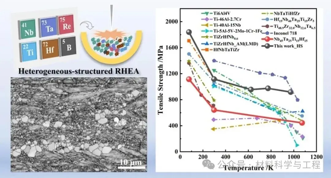 在航空航天、核能以及先进制造等前沿领域,结构材料需要在从深冷到高温的复杂环境中长期稳定服役。然而,传统合金普遍存在“强度–韧性”矛盾:强度提升往往伴随延展性降低,且在高温下强度衰减尤为明显。难熔高熵合金(RHEAs)由Nb、Ta、Mo、W、Hf等高熔点元素组成,凭借其优异的高温性能备受关注,但迄今仍难以在宽温域内兼顾高强度与高延展性。近年来,异质结构金属材料因其可诱发“异质变形诱导强化(HDI)”效应而备受瞩目,为解决强度–韧性矛盾提供了新思路。