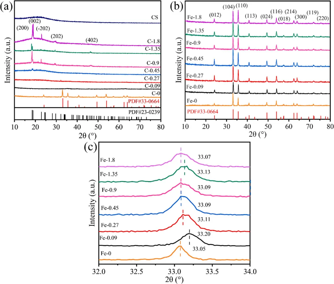 图1 XRD(a)前驱体,(b)Fe2O3(c)在32-34º范围内局部放大图。 图2 (a)C-0.09、(b)C-0.27、(c)C-0.45、(d)C-0.9、(e)C-1.35和(f)C-1.8的SEM图像。 图3 (a)Fe-0.09、(b)Fe-0.27、(c)Fe-0.45、(d)Fe-0.91、(e)Fe-1.35和(f)Fe-1.8的SEM图像。 图4 XPS谱图:(a)全谱,(b)Fe2p,(c)O1s,(d)C1s。 图5 空心Fe2O3机理示意图。 4. 小结 综上所述,通过调节反应体系中的葡萄糖浓度,可以精确控制Fe2O3结构的形成过程和最终形貌:在低浓度(<0.45M)下,形成纳米颗粒,在中等浓度下,动态平衡机制促进碳层均匀包裹核心并自组装成规则的微球结构;而在过高浓度(>0.45M)时,由于碳层的过度生长,结构变得不稳定。在反应过程中,葡萄糖氧化产生的有机酸与Fe3+或Fe2+(Fe3+还原)结合形成金属有机中间相,该中间相的热力学演化最终产生Fe2O3。Fe-0.45的最终形貌光滑圆润,平均粒径为2.88μm,平均孔径为20.3nm,比表面积为20.1m2/g。 数据来源与出处 相关研究成果以“Hydrothermal synthesis of hollow Fe2O3 microspheres: effect and mechanism of glucose concentration”为题,发表在《Materials Science & Engineering B》上。