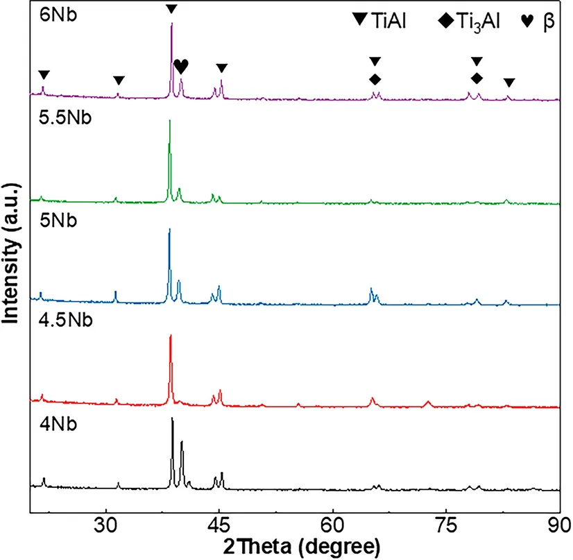 本研究采用Ti-46Al-2.8Fe-xNb(4-6 at.%)合金体系,通过电弧熔炼与多次重熔获得成分均匀的(β+γ)全层片组织,并以Nb含量作为主要调控变量。研究团队利用SEM/EDS分析相组成与层片结构,结合TEM/HRTEM与SAED观察位错、层错和孪晶的形成,同时借助 GPA表征界面应力场,并通过XRD评估堆垛层错能变化。随后,通过室温压缩与750 ℃拉伸实验系统评估Nb对强度与塑性的影响,从而构建成分调控—微结构演化—力学性能提升的完整关联机制。
