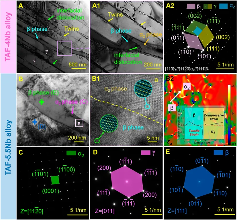 TAF-xNb合金的TEM图像显示相界面、SAED花样及界面应力分析