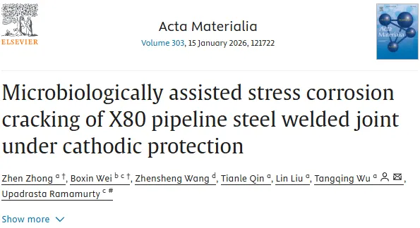 2025年11月9日,材料领域国际期刊《Acta Materialia》在线发表了题为“Microbiologically assisted stress corrosion cracking of X80 pipeline steel welded joint under cathodic protection”的研究论文,全面研究了X80管线钢焊接接头在SRB活性环境中不同阴极保护(CP)电位下的SCC行为,阐明了SRB和CP在SCC引发和扩展中的协同作用。通讯作者为湘潭大学吴堂清教授。