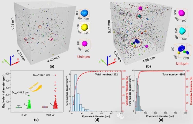图1 不同激光功率下Al-Zn-Mg-Cu合金沉积样件气孔分析:(a)P=0 W时气孔三维CT重建;(b)P=240W时气孔三维CT重建;(c)气孔等效直径分布;(d)P=0 W时气孔数量密度及累积频率;(e)P=240 W时气孔数量密度及累积频率