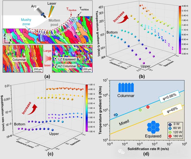 激光功率的优化调控改善了晶粒形貌。当激光功率为0 W时,组织以粗大柱状晶为主,平均晶粒尺寸为70.1 μm;当功率提升至180 W时,形成电弧区柱状晶+激光区等轴晶的双峰组织,等轴晶比例达50%,平均晶粒尺寸降至30.4 μm,细化幅度达到57%。结合熔池凝固过程CFD模拟,探讨了微观组织的形成及演变机理。从熔池底部到顶部,熔池固液界面的温度梯度迅速减小,而激光功率的增加会显著提高整体温度梯度。将不同激光功率下模拟获得的温度梯度和凝固速率标注在CET图中,低激光功率下凝固组织完全处于柱状晶生长区域。当激光功率处于120 W~180 W之间,凝固条件在CET图中的位置逐渐向混合生长区域移动,形成柱状晶与等轴晶共存的组织特征。