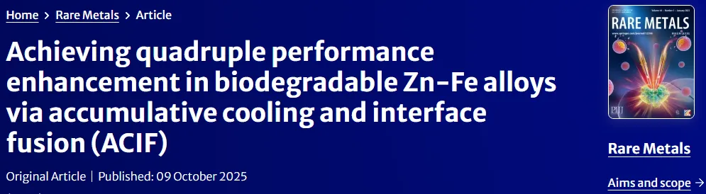 近期,材料领域的国际期刊《Rare Metals》在线发表了题为“Achieving quadruple performance enhancement in biodegradable Zn-Fe alloys via accumulative cooling and interface fusion (ACIF)”的研究论文,该论文的研究团队提出了累积冷却与界面熔合技术(Accumulative Cooling & Interface Fusion,ACIF),在30 mm厚截面的Zn-0.4Fe合金中实现整体快速凝固,并在挤压后获得远超传统Zn-Fe合金的四重性能提升:包括更高的屈服强度、更大的延展性、更均匀的腐蚀行为以及更优的细胞生物活性。这一突破性成果解决了Zn基可降解金属长期面临的“强塑难兼得、粗大第二相难抑制、厚截面冷却速率受限”等关键技术难题,为Zn合金在骨固定与血管植入器械领域的大规模应用奠定了基础。通讯作者为北京科技大学的新金属材料全国重点实验室的石章智教授和王鲁宁教授。