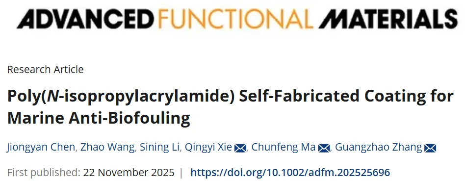 2025年11月22日,相关工作以“Poly(N-isopropylacrylamide) Self-Fabricated Coating for Marine Anti-Biofouling”为题,发表于Advanced Functional Materials。华南理工大学博士生陈炯延为论文第一作者,张广照教授、马春风教授与谢庆宜专职研究员为通讯作者。