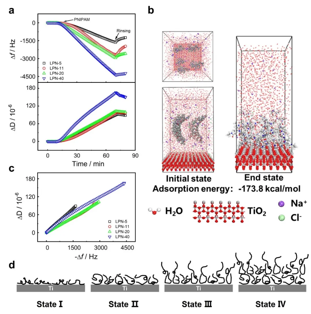图2. PNIPAM在钛合金表面吸附行为及自构筑涂层示意图