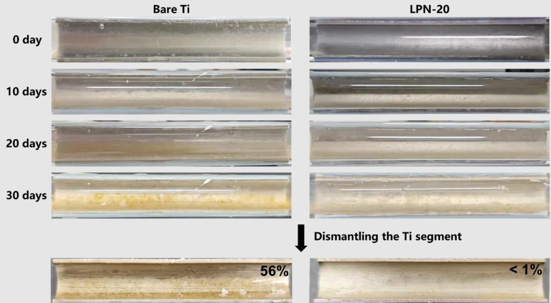 PNIPAM作为一种温敏性聚合物而被广泛关注,是一种经典的高分子材料,但其以往研究主要聚焦于其温敏性及其生物医学领域的应用潜力。在本工作中,该团队利用PNIPAM适宜的亲疏水性以及与钛合金表面的配位作用,实现了材料的原位成膜防护,探索出PNIPAM在海洋工业的创新应用。在合适的分子量下,PNIPAM聚合物链可自发吸附于钛合金表面并形成稳定涂层,部分链段通过相互作用力稳定锚定于管壁,另一部分则在溶液中伸展形成水合层,从而有效抑制污损生物的粘附。特别是,若涂层在海水冲刷过程逐渐脱落,可通过相同操作实现涂层的再生,可操作性强。