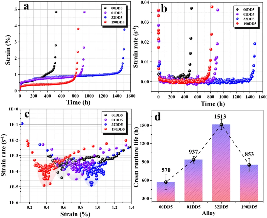 作者制备了四种Y掺杂合金(00DD5、01DD5、32DD5、190DD5,对应Y浓度0、10、320、1900 ppm),通过定向凝固确保[001]取向单晶。蠕变测试采用圆柱试样在1100 ℃/100 MPa下进行,结合SEM、STEM、HR-XRD等多尺度表征分析微观结构演化。此外,利用Darken扩散模型、Eshelby应力计算和修正的Norton方程,量化了扩散系数、晶格失配及蠕变寿命预测。