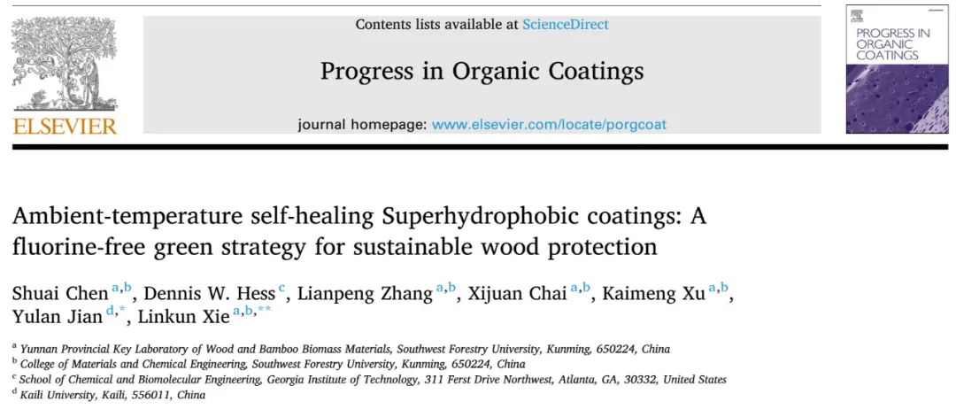 近期,西南林业大学解林坤团队、凯里学院蹇玉兰团队成功制备了一种无氟、室温下自主运行的自修复超疏水木材涂层。