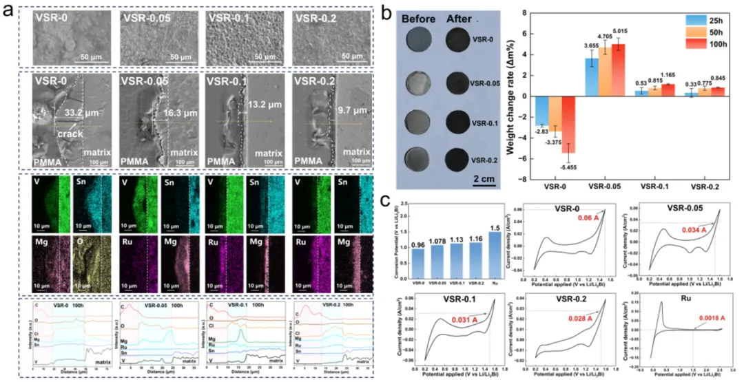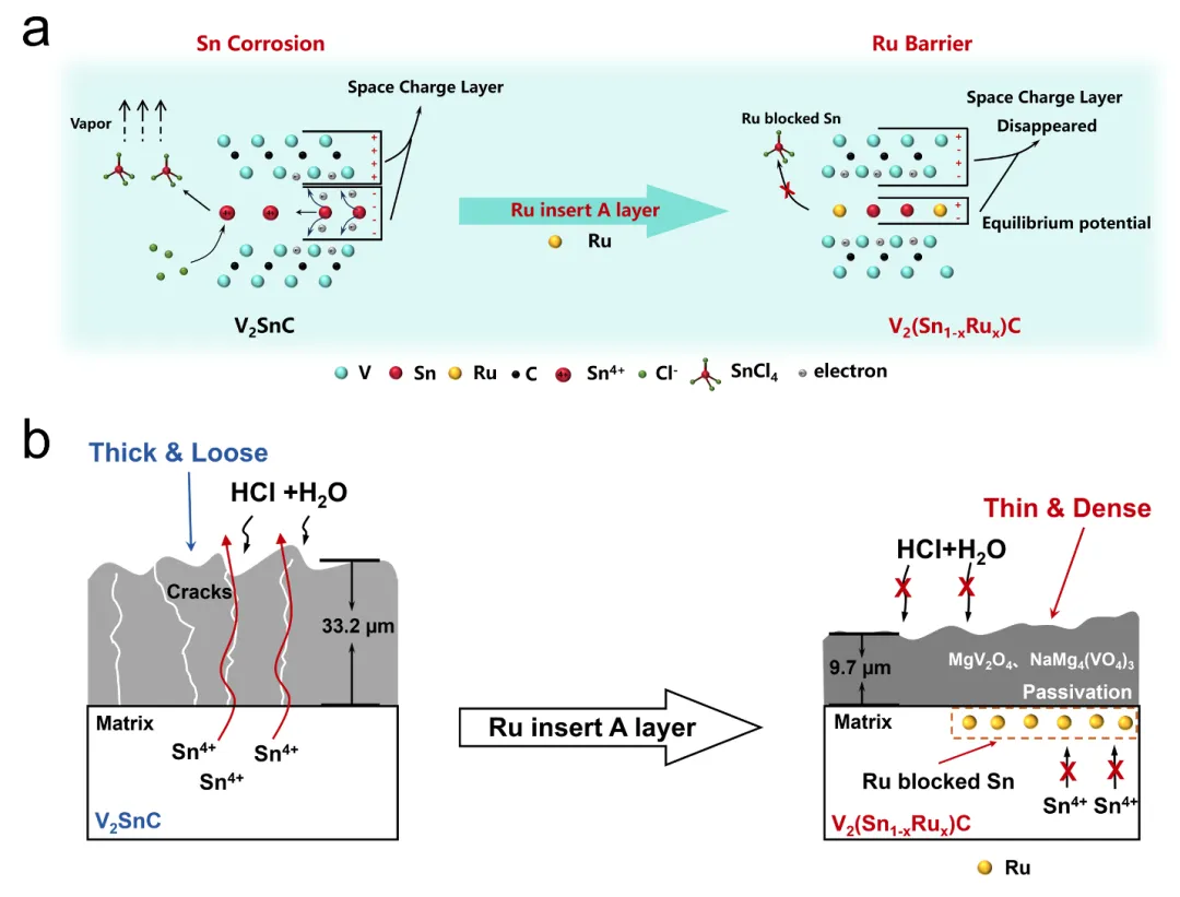 新型热能储能系统普遍采用高温氯化物熔盐作为储热介质,这些高腐蚀性熔盐在高温运行环境下会对系统中合金结构材料造成严重腐蚀,开发新型耐高温腐蚀结构材料成为推动该能源领域发展的关键。具有独特层状结构的三元碳化物MAX相材料(Mn+1AXn)兼具金属的优异导电导热性与陶瓷材料固有的高熔点、高热稳定性和良好机械强度,是下一代高温结构材料的理想候选者。该类材料的六方晶系结构由交替排列的M6X八面体层和A元素原子层构成,层间相对较弱的M-A键在极端环境下(高温氧化、腐蚀、电化学等)会发生显著的化学氧化,从而造成结构转变和物理性能的恶化。如何改善MAX相材料M-A亚层在极端条件上的结构稳定性是面向应用亟需攻克的难题。 近期,中国科学院宁波材料技术与工程研究所全省数据驱动高安全材料及应用重点实验室科研人员成功合成V2(Sn1-xRux)C(x = 0, 0.05, 0.1, 0.2)固溶型MAX相材料,其中A位原子引入了具有高氧化还原电位的钌(Ru)元素。腐蚀研究表明,相对比常规V2SnC材料,V2(Sn0.8Ru0.2)C在700℃的MgCl2-NaCl-KCl熔盐中腐蚀100小时后,表现出增重行为——这源于其表面形成了致密的保护性腐蚀产物层,且腐蚀层厚度从33.2 μm显著降低至9.7 μm,未发现明显腐蚀裂纹。700℃原位电化学测试研究发现Ru的引入使MAX相材料的开路电位从0.96 V显著正移至1.16 V,氧化电流密度大幅降低,表明其热力学稳定性和动力学耐腐蚀性均得到增强。该研究揭示了A位引入贵金属元素能够抑制腐蚀性元素扩散,促进保护性钝化层形成,为MAX相用于下一代聚光太阳能系统等极端环境应用提供了新思路。 图1 MAX相材料A层引入Ru后前后腐蚀结果:(a) MAX相块体100小时腐蚀后的表面/截面SEM及元素分布谱图;(b) 腐蚀前后宏观表面形貌及质量变化:(c) 700℃熔融MgCl2-NaCl-KCl中五种材料电化学测试 图2 (a) MAX相材料A层引入Ru后对电子调控示意图;(b) MAX相腐蚀层变化示意图 相关成果 Electrochimica Acta A-Site substitution in V2SnC MAX phase for enhanced corrosion resistance in high-temperature molten salts DOI: 10.1016/j.electacta.2025.147700 项目支持 国家自然科学基金 12435017, U23A2093, 52172254, 52202325