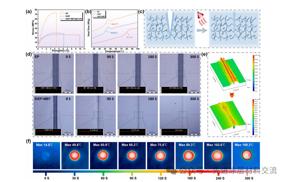 图3(a)EP、SiEP和SiEP-MBT@PLDH的应力-应变曲线和(b)DSC曲线。(c)SiEPMBT@PLDH的光热自修复机制。(d)EP和SiEP-MBT@PLDH之间的划痕修复过程比较。(e)SiEP-MBT@PLDH的三维形态。(f)SiEP-MBT @PLDH在NIR光下不同时间的IR图像
