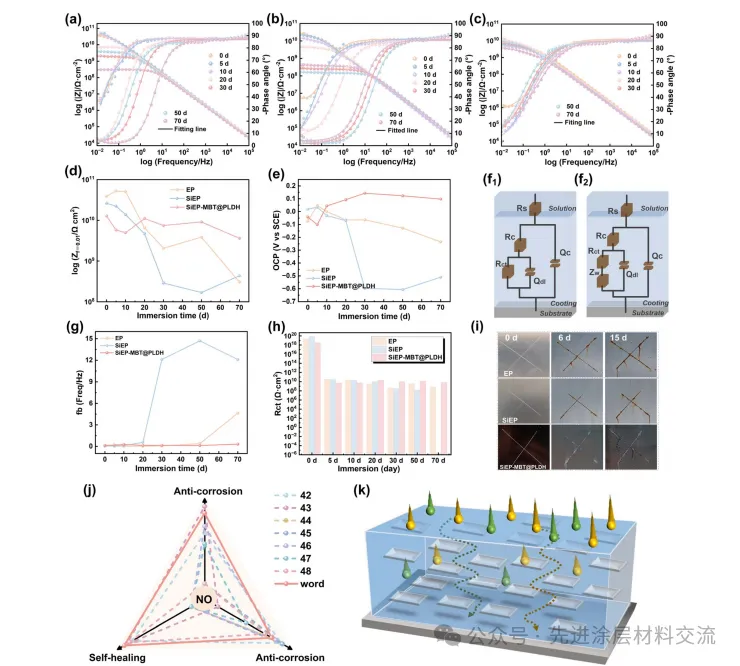 图5(a)EP、(b)SiEP和(c)SiEP-MBT@PLDH的Bode和Bode相位角图。(d)jZj 0.01值;(e)OCP值;(f)初始30 d(f1)和第50 d(f2)的拟合等效电路模型;(g)fb值;(h)Rct值;(i)EP、SiEP和SiEP-MBT@PLDH的盐雾试验结果。(j)本研究所提出的综合涂层与其他已报道的海洋防护涂层的性能比较。(k)SiEP-MBT@PLDH的防腐蚀机理图