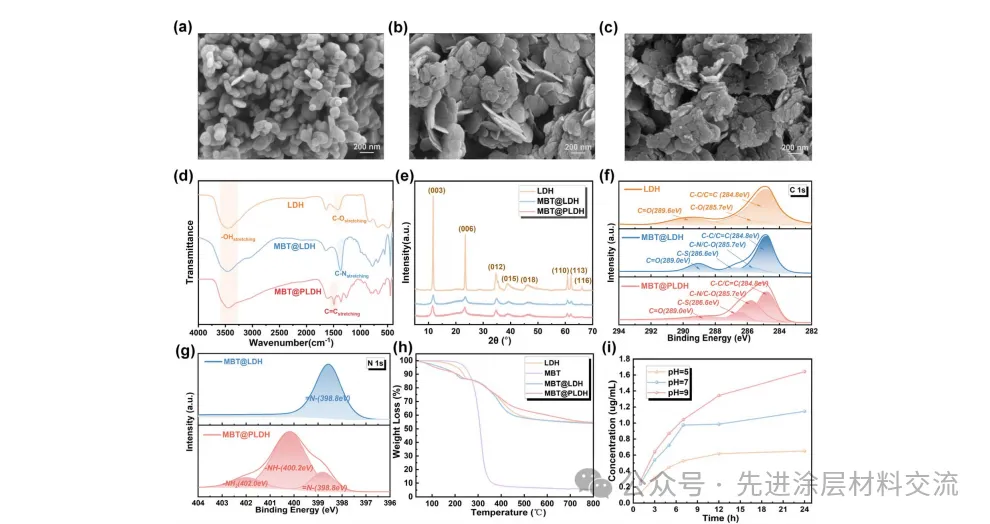 图2(a)LDH、(b)MBT@LDH和(c)MBT@PLDH的SEM图像。(d)LDH、MBT@LDH和MBT@PLDH的FTIR光谱和(e)XRD图案。(f)C 1 s和(g)N 1 s的XPS精细光谱。(h)LDH、MBT@LDH和MBT@PLDH的TGA曲线。(i)MBT@PLDH在不同pH条件下的释放过程