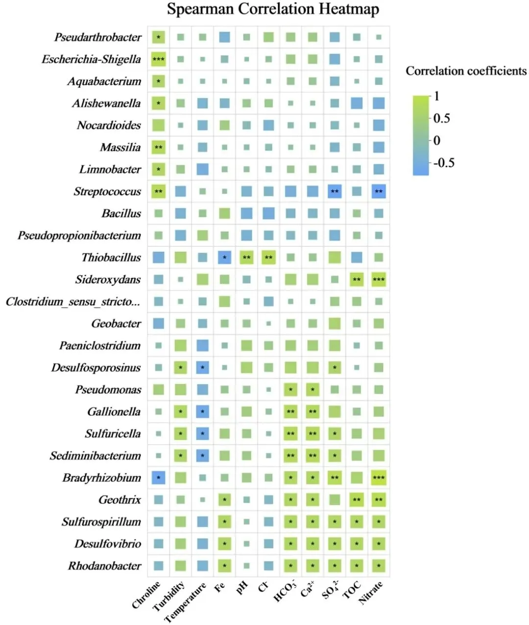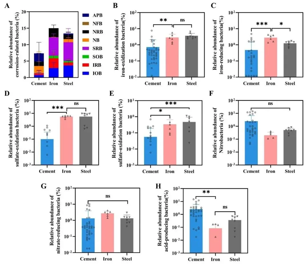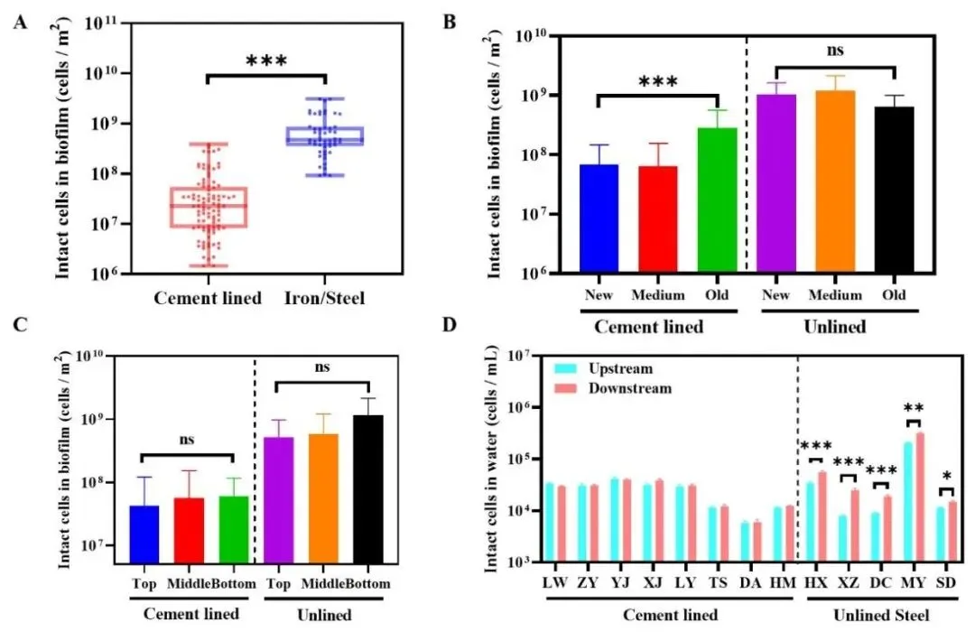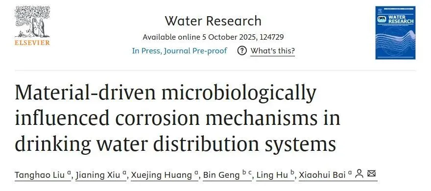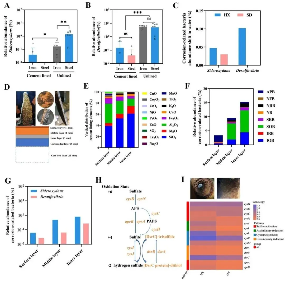 金属管道在供水管网中历史悠久且应用广泛,其长期存在的腐蚀问题仍是导致水质劣化与基础设施老化的核心挑战。腐蚀过程不仅引发铁、锰等重金属释放,更在管道内壁形成复杂的生物膜,二者协同作用,严重威胁饮用水安全。目前,尽管研究已识别出多种与腐蚀相关的功能性微生物,但关于管道材质、保护性内衬如何与附着生物膜相互作用,从而驱动差异化腐蚀机制这一关键科学问题,仍缺乏系统性的现场实证与机理阐释。为此,本研究通过对上海市在役的21根不同材质、不同服役年限的现场管道进行系统性调查,整合流式细胞术、16S rRNA 高通量测序及宏基因组学等多维度分析技术,旨在揭示材料特异性生物膜群落的构建规律及其功能分化,并阐明关键微生物类群通过硫酸盐还原、产酸等代谢途径加剧管道腐蚀的微观机制。 由脱硫弧菌属Desulfovibrio spp. 产生的硫酸盐还原是加速无涂衬金属管道腐蚀的主要机制。 产酸链球菌属Acidogenic Streptococcus spp.可作为水泥涂衬球墨铸铁管铁释放的特征微生物。 在不同材质供水管壁生物膜中的腐蚀相关微生物是由不同水化学指标分别调控的。 研究进展 本研究构建的“材料-化学-生物膜”三元互作框架,为理解老化供水管网中微生物腐蚀的驱动机制提供了新视角,并为建立非侵入性的腐蚀风险预测与精准防控策略提供了理论基础。 图1 图文摘要 如图2,通过对19处现场管段内腐蚀形貌的宏观解析,系统揭示了不同材质供水管道随服役年限增加的腐蚀演变规律。结果表明,球墨铸铁管在水泥内衬保护下,其抗腐蚀性能显著优于无内衬管道。具体而言,服役≤20年的球墨铸铁管内衬保持完整,未见明显腐蚀产物渗透;而当服役年限达到25年时,开始出现内衬局部破损与基材暴露现象。在无保护层的管道中,腐蚀进程明显加速,其中无内衬钢管表现出最为严重的劣化特征,管壁表面形成大量瘤状腐蚀结瘤。该系列结果直观证实,水泥砂浆内衬能够通过维持材料形态完整性与延缓结构降解,有效提升球墨铸铁管在供水管网中的长期耐腐蚀性能。 Fig. 2. Corrosion progression and associated structural modifications in metallic water distribution pipelines. Pipe characteristics are coded as: I(cast iron), DI (ductile iron), S (steel), and C (cement mortar lining), with nomenclature reflecting pipe material/coating-age relationships. (A) Temporal corrosion patterns in cement-lined water mains: Left panel - Ferrous alloy pipes (cast iron/ductile iron), Right panel - Steel pipe variants. (B) Unprotected corrosion evolution in urban water infrastructure: Left panel - Cast iron conduit degradation, Right panel - Carbon steel pipe deterioration. Fig. 3. Flow cytometry-based viability profiling of bacterial communities in pipe biofilms and adjacent hydraulic compartments. (A) Comparative viability between cement-mortar-lined and uncoated metal pipe surfaces. (B) Biofilm viability stratification by pipe service duration: New (0–10 years), Medium (10–30 years), and Old (>30 years) groups. (C) Longitudinal distribution of biofilm viability across upper, middle, and lower pipe cross-sections. (D) Hydraulic transport dynamics reflected in viable cell counts from upstream and downstream water columns across pipe materials. 通过流式细胞术对管壁生物膜活菌密度的定量分析揭示,无内衬保护的金属管道表面生物膜生物量显著高于水泥内衬管道,其活菌密度可达后者的13.5倍以上。研究进一步发现,生物膜的积累随管道服役年限呈现材料依赖性:水泥内衬系统随老化出现生物膜的持续增长,这与其内衬逐步破损、基底金属暴露相关;而无内衬钢管的生物膜生物量则在达到高位后趋于稳定。此外,研究未在金属干管中发现显著的生物膜径向分布差异,但在腐蚀严重的无内衬或内衬破损管道中,观察到显著的生物膜脱落现象。这些结果表明,腐蚀初期为生物膜定殖创造了有利条件,而后期形成的腐蚀产物在维持高生物量的同时,也增加了生物膜脱落与微生物释放的风险。 本研究通过微生物群落分析,揭示了供水管网生物膜群落结构具有显著的材料依赖性与时间动态性。研究发现,钢管中的生物膜群落丰富度显著高于铸铁管,而水泥内衬则能有效削弱材料本身对群落结构的影响。统计分析进一步确认,管道材质与服役年限是塑造生物膜群落结构的两个关键因素。 Fig. 4. 16S rRNA profiling reveals material composition and service duration impacts on pipeline biofilm consortia structure. (A-B) Non-metric Multidimensional Scaling (NMDS) ordination employing Bray-Curtis dissimilarity metrics evaluates β-diversity variations in pipeline biofilm communities under different: (A) infrastructure aging gradients; (B) substrate material compositions. (C) Taxonomic composition histograms illustrating material-dependent phylogenetic distribution patterns in adherent biofilms. (D) Differentially abundant microbial taxa (genus-level) between cement-lined and unalloyed ferrous pipelines identified through Student's t-test with Benjamini-Hochberg correction (P <0.05). (E) LEfSe biomarker discovery analysis delineating phylogenetically distinct genus in carbon steel versus cast iron surface biofilms using linear discriminant analysis (LDA) effect size threshold >2.0 (P <0.05, FDR-corrected). 在菌群演替方面,研究观察到随服役时间增长,Pseudomonas 和 Acinetobacter 等具有强成膜能力的菌属比例显著上升。更重要的是,不同材质管道表面选择性富集了功能迥异的菌群:水泥内衬表面主要富集Comamonadaceae,而无内衬的金属表面则特异性富集以 Desulfovibrio 