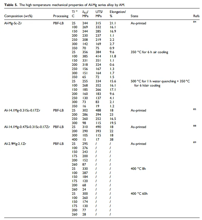 Al-Mg系:Scalmalloy®(Al-Mg-Sc-Zr)是明星材料,室温强度超500 MPa,250℃下仍能保持200 MPa以上,但300℃后强度会骤降至100 MPa以下,需进一步提升热稳定性。