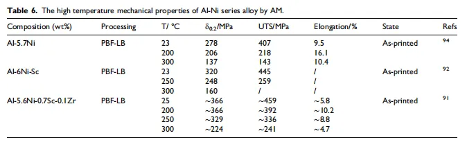 Al-Ni系:Al₃Ni相是核心强化相,PBF-LB打印的Al-5.7Ni合金室温强度407 MPa,300℃仍有143 MPa。若复合添加Sc、Zr,形成“细胞结构+纳米沉淀”双强化,300℃强度可再提升68%;