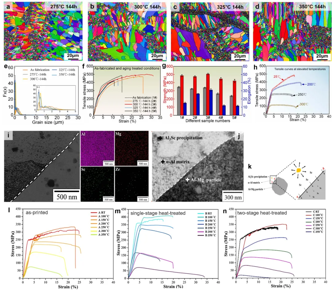 图17、(a,b)铝锌镁铜合金相图及其对应的析出温度范围;(c)热处理试样高温拉伸试验前后的扫描透射电镜图像。(e)沉积态试样与(f)热处理试样的明场TEM图像。(g,h)高温拉伸试验后断裂截面的能量色散X射线衍射图谱(IPF)和金相分析图谱(KAM);(i)沉积态试样与热处理试样的金相分布及(j)取向图谱
