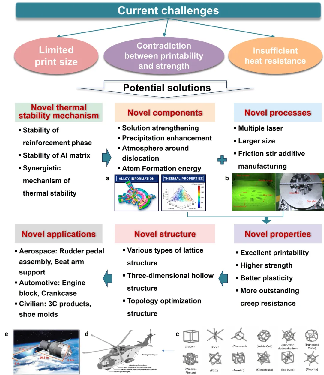 图28、(a)合金设计方法。(b)多激光增材制造。(c)不同类型的晶格结构。(d)阿古斯塔-韦斯特兰EH101直升机。(e)“天宫一号”资源舱和太阳能电池翼