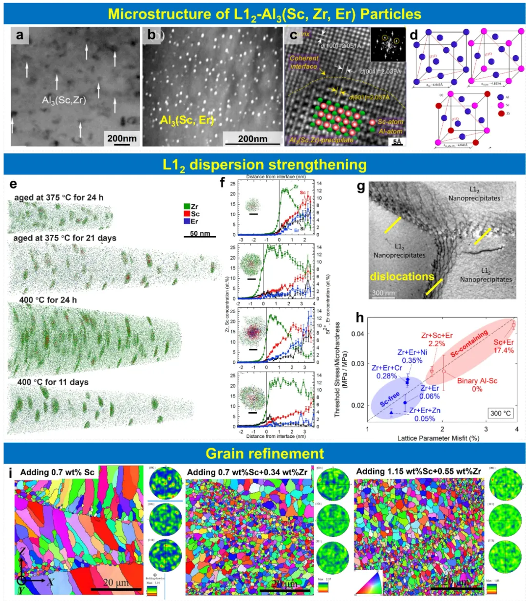 图22、L12颗粒的显微结构:(a)Al3(Sc,Zr);(b)Al3(Sc,Er);(c)纳米L12析出相与铝基体的界面;(d)Al、Al3Sc和Al3(Sc,Zr)晶胞示意图;(e)经640°C均质化8小时后,Al-0.08Zr-0.014Sc-0.008Er-0.10Si元素在375°C等温时效24小时和21天,或400°C等温时效24小时和11天的三维(3-D)原子位错点重构;(f)基体/析出相界面的浓度分布图。(g)L12颗粒的存在会阻碍位错运动。247(h)比较了基础合金(Zr + Er)、铬改性合金(Zr + Er + Cr)和锌改性合金(Zr + Er + Zn)在300°C蠕变测试中,L12纳米析出相的晶格参数失配与归一化阈值应力的对比;(i)不同钪、锆含量铝合金的异形相和非晶相。通过共改性钪和锆纳米颗粒成功引入均质超细等轴晶粒,这有助于形成预期的原位Al3(Sc,Zr)成核粒子