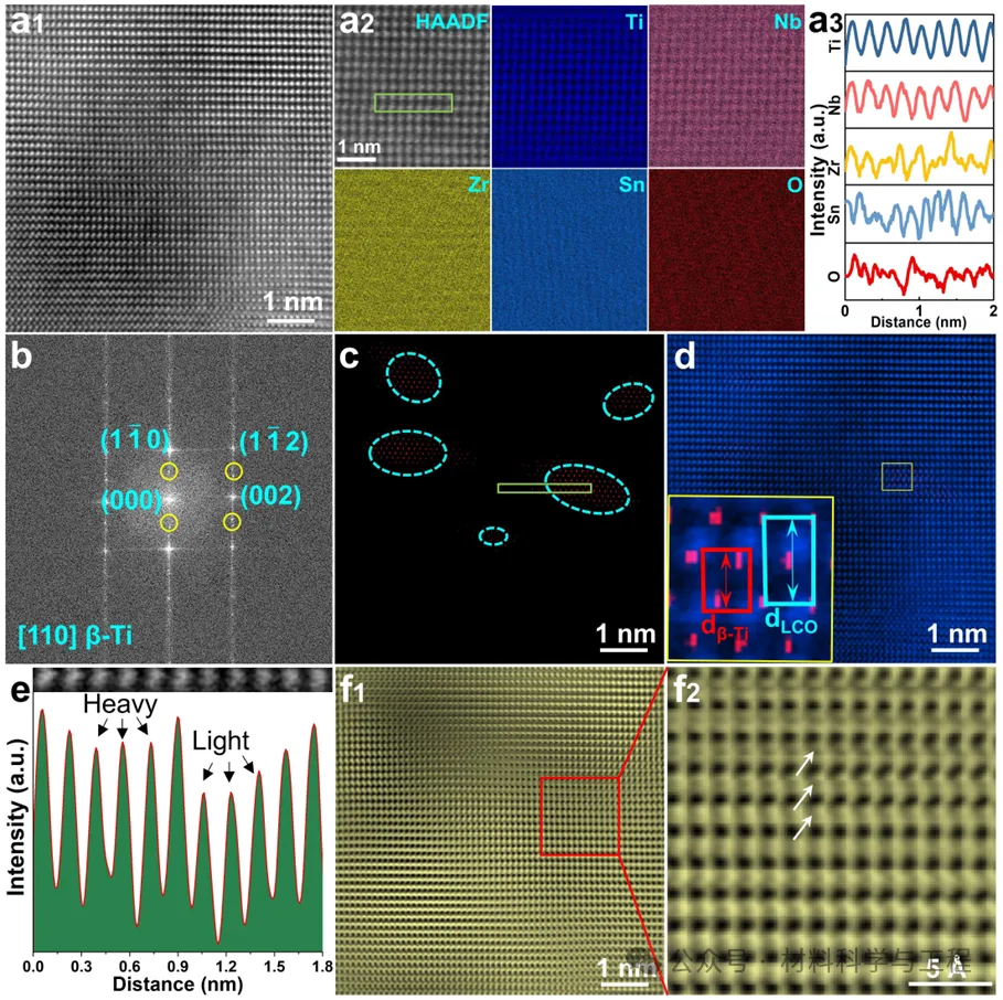 图4 HT-TNZSO合金中β-Ti基体的球差校正透射电镜显微组织。(a1) 沿[110] β-Ti晶带轴的β-Ti基体的STEM-HAADF图像;(a2) 放大的HAADF图像及其对应的原子分辨率EDS图像;(a3) 图(a2)中黄色方框区域元素分布的线扫曲线图;(b) 图(a1)对应的FFT图像;(c) β-Ti基体中LCO结构畴的IFFT图像;(d) 叠加BCC-Ti晶格的LCO畴的IFFT图像。插图为黄色区域的放大图像;(e) 图(c)中黄色区域的强度分布图;(f1) β-Ti基体的STEM-ABF图像。(f2) 图(f1)中红色方框的放大图像,显示β-Ti基体中的LCO结构