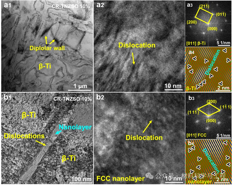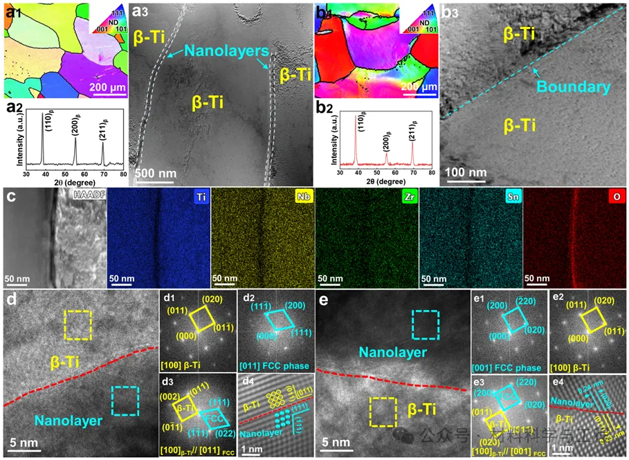 图2. HT-TNZSO与HT-TNZS合金的微观结构特征。(a1) HT-TNZSO合金的EBSD IPF图,(a2) XRD图谱和 (a3) TEM图像;(b1) HT-TNZS合金的EBSD-IPF图,(b2) XRD图谱和 (b3) TEM图像;(c) 图(a3)中界面纳米层的EDS成分图;(d) β-Ti相与界面纳米层之间的界面HRTEM图像:(d1) 图(d)中黄色区域的FFT图像;(d2) 图(d)中蓝色区域的FFT图像;(d3) 图(d)中界面的FFT图谱;(d4) 图(d)中界面的HRTEM图像;(e) β-Ti相与纳米层之间界面的另一张HRTEM图像:(e1) 图(e)中蓝色区域的FFT图谱。(e2) 图(e)中黄色区域的FFT图像;(e3) 图(e)中界面的FFT图案;(e4) 图(e)中界面的HRTEM图像