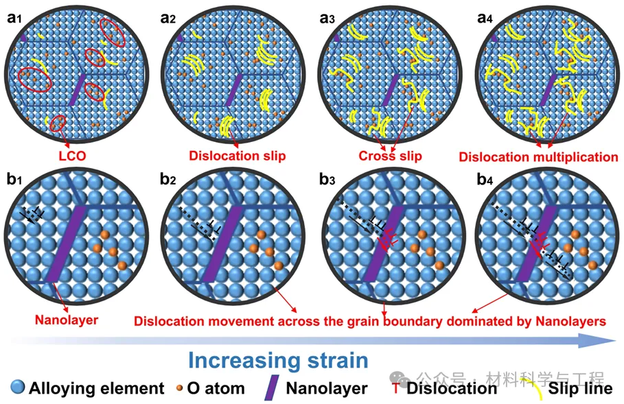 揭示氧驱动的晶内和晶界协同强韧化机制:晶内LCO结构可实现位错滑移由平面向波状转变,促进双交叉滑移和位错增殖提高应变硬化能力,而晶界FCC富氧纳米层的本征塑性及其与基体的共格界面可促进晶界位错滑移并抑制晶界软化。有效打破了β-Ti合金强度–延展性互斥难题。