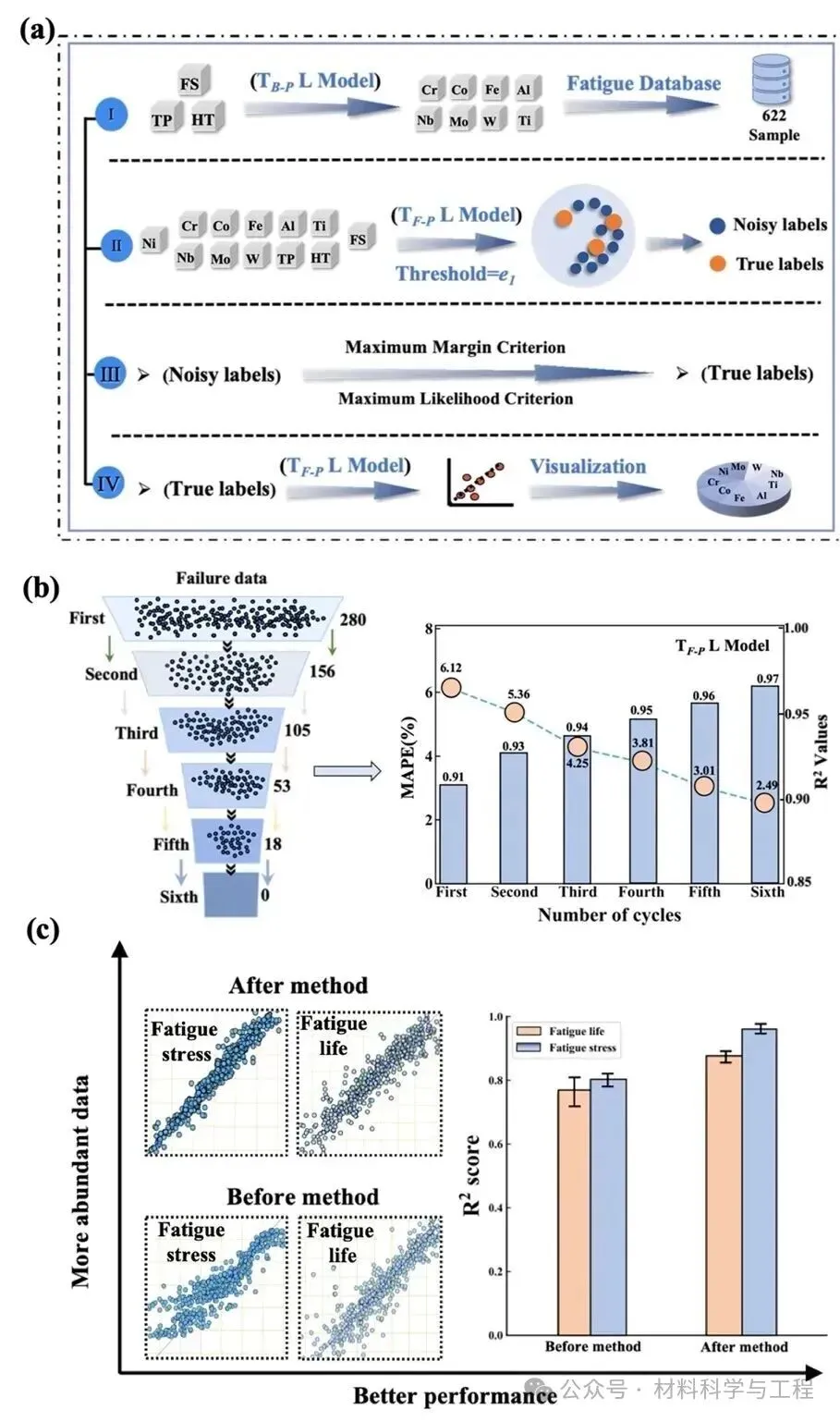高温合金是航空航天、能源动力等国家重点领域关键装备的核心材料,其在高温高压环境下的性能预测是决定设备安全可靠性的核心指标。近年来,随着计算科学的迅猛发展,机器学习在预测高温合金性能方面取得了显著成就。例如,结合高通量实验和引入物理信息描述符的机器学习算法预测疲劳寿命,提高模型精度与解释性。然而,在材料研发与应用过程中,由于合金成分、热处理工艺等数据记录常常存在不完整或缺失的情况(即“模糊数据”),这严重制约了传统机器学习方法的预测能力。因此,如何基于这些不确定性的数据进行准确的性能预测,一直是该领域面临的一大挑战。 针对这一难题,河北科技大学苏孺教授团队联合上海交通大学、北京科技大学学者创新性地将两种机器学习技术—“迁移学习”与“部分标签学习”相结合,构建了一个能够高效处理数据不确定性的预测框架。该框架能够利用从相关材料体系中学到的通用知识,来智能地补全和修正当前数据集中缺失或模糊的关键信息。通过这一策略,该框架成功实现了从不完整的初始数据中精确“提炼”出高温合金的真实组成,基于被该框架“修正与增强”的数据,疲劳性能预测模型的准确性和泛化能力均得到了显著提升。 相关工作以题为“Data-driven fatigue prediction of superalloys: a novel strategy integrating transfer learning and partial label learning for addressing ambiguous data”研究性论文发表在《Advanced Science》。河北科技大学博士研究生吕浩鹏为论文第一作者,河北科技大学吴大勇副教授、苏孺教授、上海交通大学饶梓元副教授为论文的通讯作者。该研究成果为解决材料科学领域普遍存在的“小数据、不完整数据”问题提供了新的思路,在高性能合金的设计、服役可靠性评估等方面具有指导意义和应用前景。 论文链接: 图1. 方法论概述。a) 结合PLL与TL进行合金成分挖掘与疲劳性能预测的新型工作流程框架。该框架分为四个主要步骤:(I) 拉伸性能与成分预测;(II) TL方法;(III) PLL方法;(IV) 疲劳性能预测。b) 模型预测疲劳性能准确性的实验验证。具体步骤包括材料制备、疲劳试验、数据采集及模型验证。 图2. PLL流程图:a) 数据消歧过程示意图及每次优化循环后失效数据的演变过程;b)模型在优化周期中MAPE与R²值的变化趋势;c) 应用PLL策略前后SVR模型MAPE与R²值的对比。