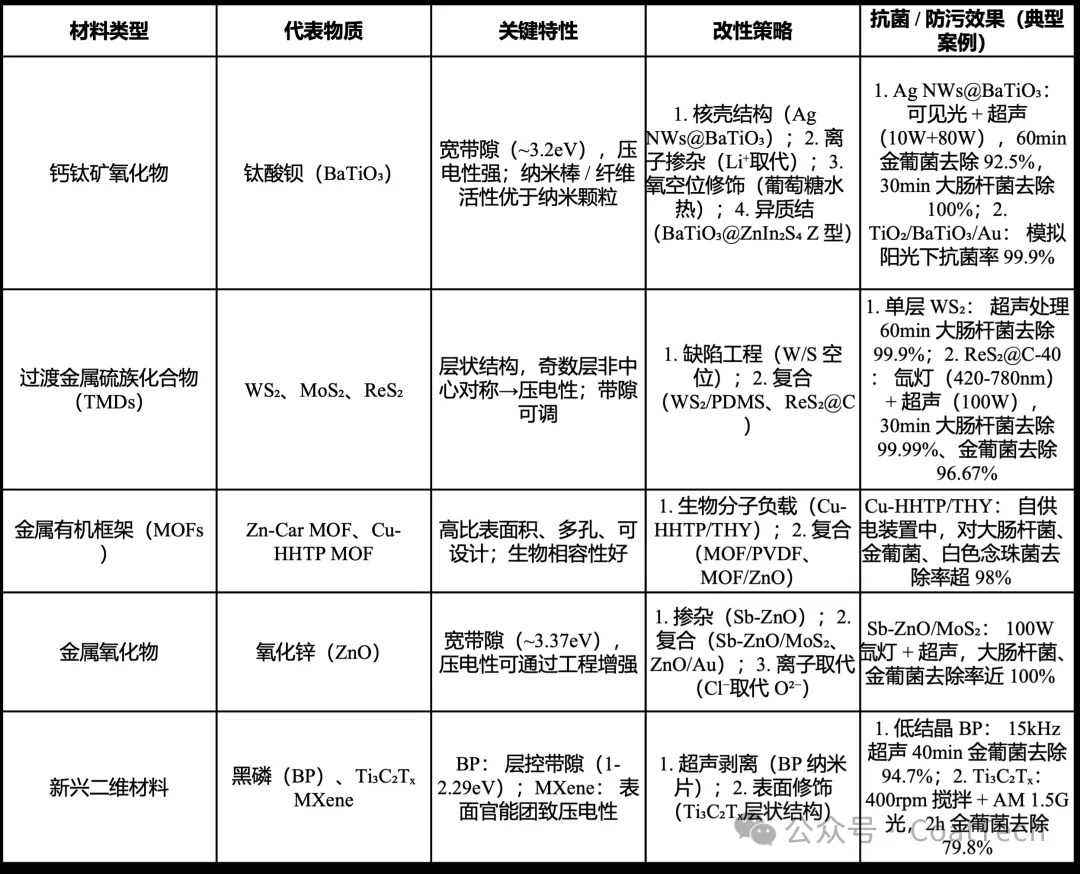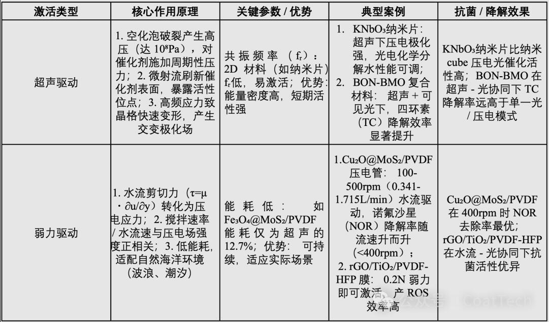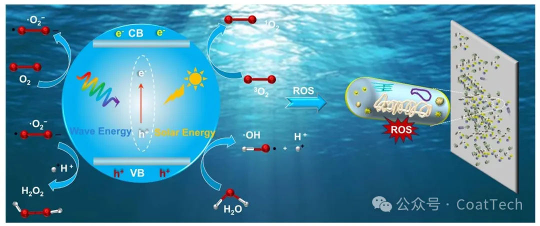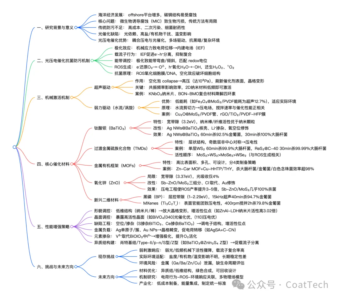一段话总结:该综述聚焦光压电催化技术在海洋抗菌防污领域的研究进展,指出传统防污方法存在高成本、污染及耐药性问题,而光催化受限于光依赖和复杂海洋环境干扰;光压电催化通过耦合压电效应与光催化,在机械应力(超声、水流等)下产生内建电场(IEF),促进光生载流子分离,生成活性氧(ROS)实现高效抗菌防污,重点介绍了钛酸钡(BaTiO₃)、过渡金属硫族化合物(TMDs)、金属有机框架(MOFs)、氧化锌(ZnO)及新兴二维材料等催化材料,阐述了形貌调控、缺陷工程、异质结构建等性能增强策略,并分析了当前弱刺激响应差、实际环境适应性不足、金属泄漏风险等挑战及未来研究方向。 文章总体思维导图 化学方法(如含铜涂料)易导致二次污染,且会诱导细菌产生耐药性; 物理方法(如机械清理)成本高、效率低,难以持续作用; 生物方法(如释放抗菌酶)稳定性差,易受海洋环境干扰。 光依赖性强: 黑暗(夜间)或光照不足(如遮蔽、波浪干扰)时失效; 环境干扰大: 高盐海水(Cl⁻、SO₄²⁻ scavenge ROS)、溶解有机物(竞争光子与 ROS)、温度波动(低温活性降、高温加速材料腐蚀)均会降低性能。 为此,光压电催化技术被提出,其通过耦合压电效应与光催化,利用机械能量(如超声、水流、潮汐)辅助光催化,构建多物理场驱动系统,解决单一光依赖问题,提升复杂环境适应性。 促进光生载流子(e⁻-h⁺对)分离: 在 IEF 驱动下,e⁻与 h⁺向相反方向迁移,显著抑制复合(传统光催化载流子复合率高,是效率瓶颈); 调控能带结构: 极化电荷积累会导致催化剂表面能带弯曲,动态调节异质结界面的电荷转移方向;同时,压电极化诱导的能带倾斜可匹配目标反应的 redox 电位,突破热力学限制。 e⁻还原溶解氧(O₂)生成超氧自由基(・O²⁻); h⁺氧化水分子(H₂O)生成羟基自由基(・OH); 后续反应中,・O²⁻与质子(H⁺)歧化生成过氧化氢(H₂O₂),光敏剂激发还可产生单线态氧(¹O₂)。 这些 ROS 具有强氧化性,通过以下方式实现抗菌防污: 破坏细菌细胞膜 / 细胞壁,导致胞质泄漏; 氧化 intracellular 成分(如 DNA、蛋白质、脂质),阻断代谢通路; 机械应力(如超声)引发的空化效应: 液体中微气泡交替膨胀 - 破裂,释放微射流和冲击波,对细菌细胞壁产生剪切力,辅助 ROS 杀菌,且高温(气泡破裂局部高温)可使蛋白质变性、酶失活。 压电-光催化抗菌与防污作用机制示意图 4.1 主要材料分类及特性 5.1 现存核心挑战光压电催化中极化效应在抗菌防污应用中的研究进展与展望