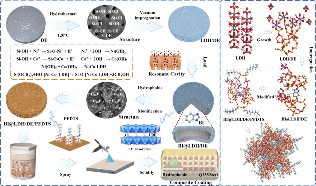 具有优异负载能力和缓释特性的载体是实现疏水涂层协同防腐的基础。硅藻土(DE)是一种由化石硅藻形成的天然多孔材料,其主要成分是二氧化硅(SiO2),具有稳定的机械性能、高比表面积、大容量、低成本和广泛的适用性,是缓蚀剂的理想载体,被广泛应用于食品、医药和催化等前沿领域。层状双氢氧化物(LDHs)是一种具有层状结构的双金属氢氧化物,对有机溶剂、酸碱溶液和高温环境具有很强的耐受性,被广泛应用于生物医学、水净化和材料改性等行业。苯并咪唑(BI)是由苯环和咪唑环稠合形成的双环化合物,苯并咪唑类有机化合物能够通过化学吸附在金属表面形成一层保护膜,防止水分子和腐蚀性介质对金属造成损伤,从而减轻金属腐蚀。