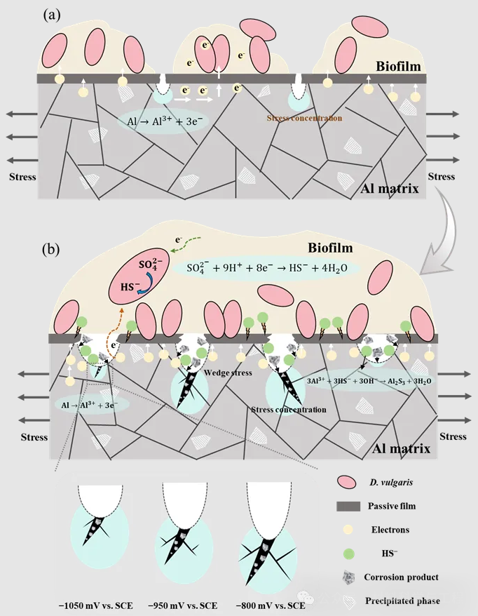 4 7xxx铝合金在D. vulgaris介质中的SCC机理示意图:(a)初始阶段,(b)成熟阶段