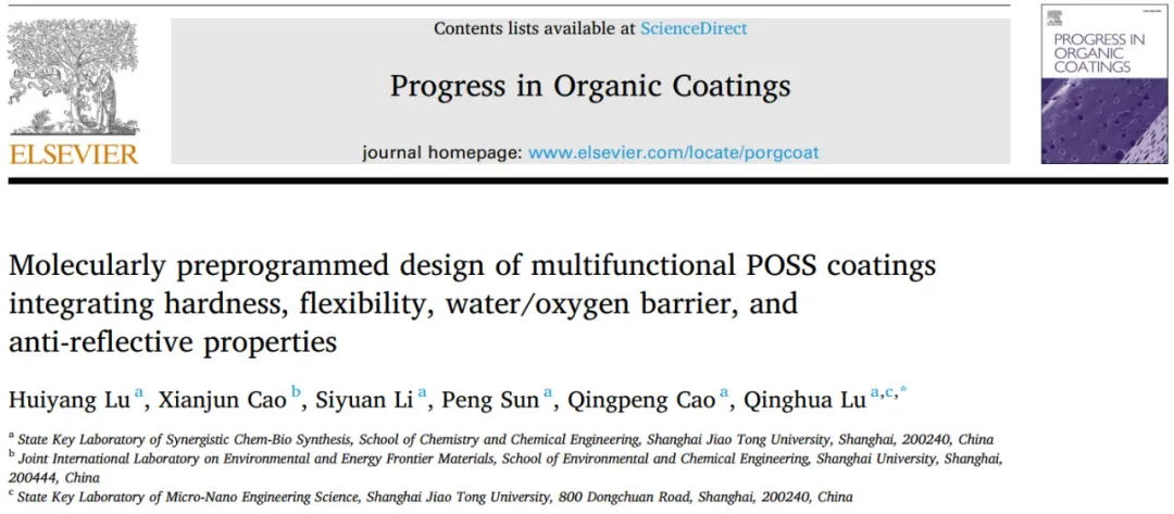 近期,上海交通大学路庆华团队采用分子预编程策略,成功制备了一种具有硬度、柔韧性、水/氧阻隔性能和抗反射性能的多功能POSS涂层。