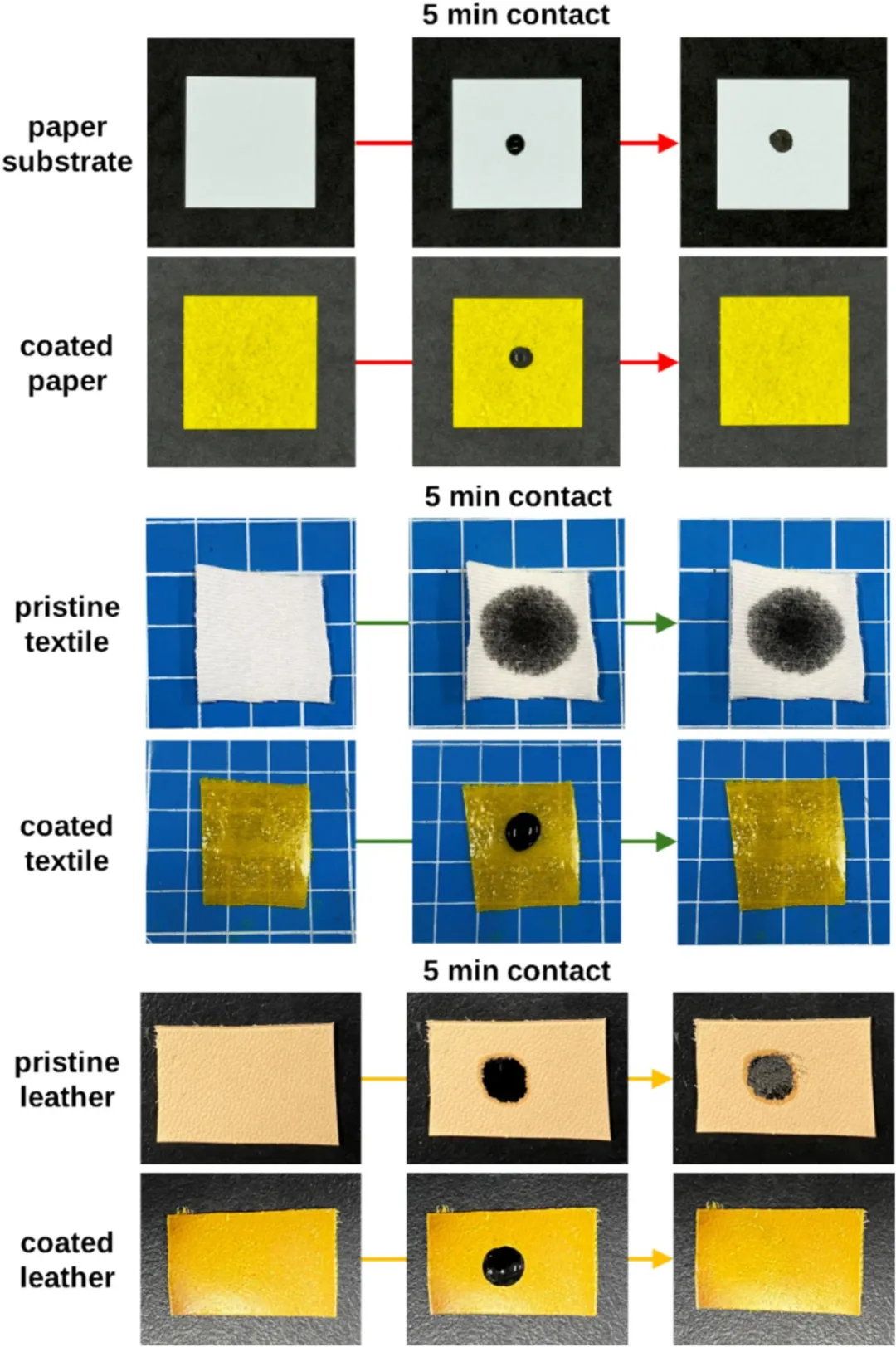 首先将姜黄素(CCM)溶解在丙酮中,与丙烯酸酯化环氧大豆油(AESO)混合,去除溶剂后得到AESO/CCM树脂混合物,然后添加甘油(GLY)或1,6-己二甲醇(HDT)制得光固化涂层树脂;通过刮涂法涂覆光固化涂层树脂,在覆盖脱模膜,随后进行UV固化,获得防水涂层。 研究表明,采用硫醇作为共引发剂制得涂层的自由基生成率比甘油体系高66%,光聚合效率显著提高。该涂层能够在30分钟内实现完全交联,凝胶分数超过99%,T10%达到317.1°C,凝胶分数和热稳定性与使用商业TPO固化相当。这些结果证实了本研究开发的生物基PIS具有优异的光固化性能。该涂层具有高度的生物相容性,细胞存活率为93%。当应用于各种基材时,该涂层显著提高了表面疏水稳定性,在16分钟内水接触角仅降低了7-8度。此外,该涂层还具有优异的防水和抗墨性能。 本研究可大规模应用且对环境友好,为绿色防水材料的开发提供了一种创新且有前景的解决方案,在下一代表面工程中具有广泛应用的潜力。 光固化树脂照片 不同混合路线制备的1wt% CCM光固化树脂的照片:(a)直接混合,(b)与共溶剂混合,(c)去除共溶剂后;(d)无覆盖和(e)有覆盖UV固化薄膜照片;(f)薄膜的FTIR光谱。 抗墨性 不同基材上抗墨性在涂层前后的对比。 数据来源与出处 相关研究成果以“Bio-derived photocurable resin for water resistant coatings”为标题发表在《Progress in Organic Coatings》上。