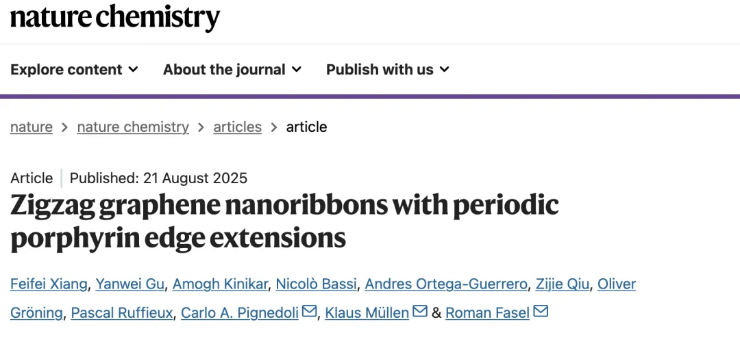 石墨烯纳米带作为一维石墨烯材料,因其非零带隙和可调控的能带结构,在半导体器件、自旋电子学及量子技术等领域展现出重要应用前景。通过自下而上的表面合成策略,可实现对其结构的精准构筑与性质的精细调控。然而,目前石墨烯纳米带的电子结构与性质调控主要依赖其π电子体系,尚未有研究成功在纳米带中引入d电子对其进行改性。卟啉作为一种大环分子,其内部空腔可实现不同金属掺杂。将卟啉结构引入石墨烯纳米带中,有望通过d-π电子间的杂化作用,进一步调控纳米带的电子结构与物理化学性质。 中国科学院宁波材料技术与工程研究所顾彦伟副研究员,联合瑞士联邦材料科学与技术研究所与德国马克斯普朗克高分子研究所,率先合成了关键前驱体分子MPor–DBA(M = 2H, Zn, Fe),并通过热诱导逐步反应,在Au(111)表面上实现了自下而上的精准合成,成功制备出一系列具有周期性卟啉边缘拓展的锯齿形石墨烯纳米带材料(MPor–3ZGNR)。研究发现: (1)Zn掺杂的ZnPor–3ZGNR具有高度分散的导带和价带电子结构,其载流子有效质量极低,展现出极高的载流子迁移潜力; (2)2HPor–3ZGNR能够自发捕获金衬底表面的Au原子,形成金属化单元,引发局部电荷掺杂,从而与未金属化单元之间形成显著的电子态差异,成功在纳米带内部构建出P–N异质结; (3)掺杂磁性金属Fe的FePor–3ZGNR中,Fe的d轨道与纳米带的π电子态发生强烈杂化,实现了相邻铁单元间的长程自旋超交换耦合。 本研究不仅为原子级精确的卟啉—锯齿边缘石墨烯纳米带杂化体系的构建提供了新方法,更通过金属中心的灵活调控,为未来开发高性能半导体、化学传感器及量子自旋链等器件,提供了一个强大而多样的材料平台。 图1 周期性卟啉边缘拓展石墨烯纳米带 相关成果 Nature Chemistry Zigzag graphene nanoribbons with periodic porphyrin edge extensions DOI: 10.1038/s41557-025-01887-9