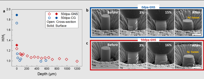 研究团队通过表面纳米化技术在广泛应用于核反应堆的304NG中制备了由高密度层错、低能界面和位错网络等结构特征组成的纳米结构(GNS 304NG,图1),使得该材料具有优异的抗辐照能力(图2)。例如,在室温超高剂量(155 dpa)辐照后,GNS 304NG样品中的辐照缺陷密度和尺寸仅为粗晶样品中的3.8%和63%;在高温(450 °C)辐照时GNS 304NG样品也同样表现出比粗晶样品更为优异的抗辐照性能。结合微观结构表征和分子动力学模拟(图3),研究团队发现,GNS 304NG优异的抗辐照性能与辐照诱发的自适应马氏体相变密切相关:辐照缺陷与材料中预制的层错相互作用而诱发马氏体相变,加速辐照缺陷的消失;此外,高密度层错还促使马氏体相向周围不断拓展,在加速消耗辐照缺陷的同时形成连续分布的马氏体相。进一步的微纳力学实验证实,GNS 304NG中大规模的自适应马氏体相变不会造成材料力学性能的恶化(图4),将传统上辐照诱发马氏体相变造成材料脆化这一有害过程转变为一个有益的过程。由于自适应马氏体相变机制在从低剂量到极高剂量、从低温到高温的辐照下均保持有效,加之所采用的表面纳米化技术具有低成本和工业上易于实现的特点,本工作表明,将表面纳米化技术与自适应马氏体相变结合,可为现行及未来核设施提供一种大幅提升抗辐照能力的策略,应用于奥氏体不锈钢及钛合金等在辐照下可发生马氏体转变的金属材料中。
