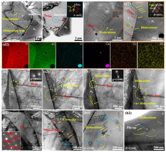 图5、Ti4822和Ti4822-0.4CaH2合金拉伸断口的TEM分析:(a-b) Ti4822合金明场像;(c-d2) Ti4822-0.4CaH2合金明场像及对应的元素面扫分布图;(e1-f2) 不同衍射矢量下α2/γ界面处位错行为;(g1-g2) 不同衍射矢量下α2相内部位错滑移行为;(h1-h2) Ti4822-0.4CaH2合金不同区域的明场像。
