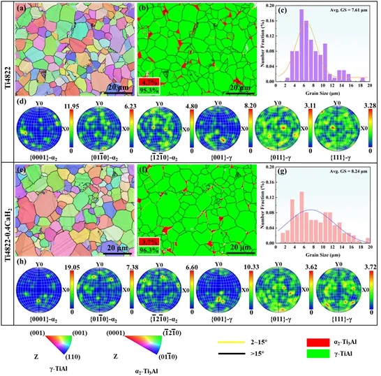 图2、Ti4822 (a-d)和Ti4822-0.4CaH2合金 (e-h)的EBSD分析:(a), (e) 反极图;(b), (f) 相分布图;(c), (g) 晶粒尺寸分布图;(d), (h ) α2和γ相极图。